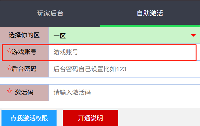 1、账号激活:按照游戏登陆的账号进行激活,游戏账号通常情况玩家自己在游戏内注册,个别游戏会有单独的注册链接(在本站某个游戏详情页面的底部【后台入口】处),若没有列出单独的注册链接则在游戏内进行注册