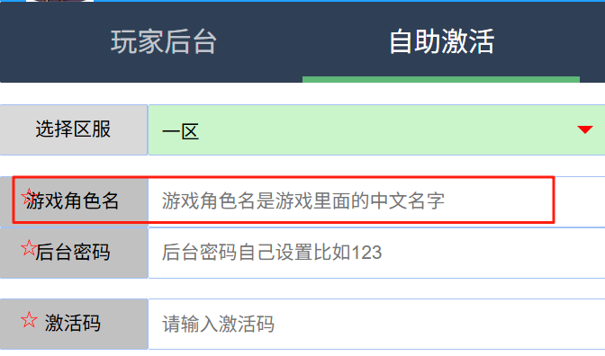 2、角色名字激活:按照游戏内的角色名称进行激活,其特性是一旦激活成功,不能修改角色名称,修改后将无法进入后台(后台按照角色名进行绑定)